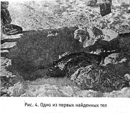 4 мая 1959 года в 75 м от костра, по направлению к долине четвертого притока р. Лозьвы, то есть перпендикулярно пути движения туристов от палатки, под слоем снега в 4-4,5 м, обнаружены трупы Дубининой, Золотарева, Тибо-Бриньоля и Колеватова. На трупах, а также и в нескольких метрах от них обнаружена одежда Кривонищенко и Дорошенко – брюки, свитеры. Вся одежда имеет следы ровных разрезов, так как снималась уже с трупов Дорошенко и Кривонищенко. Погибшие Тибо-Бриньоль и Золотарев обнаружены хорошо одетыми, хуже одета Дубинина – ее куртка из искусственного меха и шапочка оказались на Золотареве, разутая нога Дубининой завернута в шерстяные брюки Кривонищенко. Около трупов обнаружен нож Кривонищенко, которым срезались у костра молодые пихты. На руке Тибо обнаружено двое часов – одни из них показывают 8 часов 14 минут, вторые – 8 часов 39 минут.