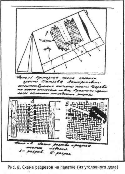 8 палатке и. около нее не было ни одной капли крови, что говорило о том, что все туристы покинули палатку без телесных повреждений. Последнее обстоятельство будет иметь в дальнейшем очень важное значение.