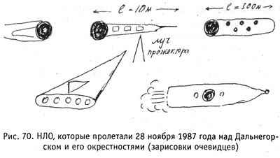 Всего было зарегистрировано 32 пролета НЛО, в том числе над Дальнегорском – 13 (по другим данным – 14). 4 НЛО прошли над «высотой 611», 3 зависли над городом, еще 5 освещали участки Дальнегорска и прилегающие горы. Высота полета объектов колебалась от 150 до 700 м. Они двигались целенаправленно вдоль рек и распадков, обходя стоявшие на пути высоты. Их формы были самые различные: цилиндрические НЛО, похожие на дирижабли длиной 150-200 м, округлыми или квадратными иллюминаторами, шарообразные объекты, светившиеся красным светом, а также объекты в форме треугольника (рис. 70).