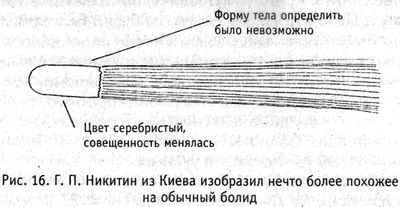 «30 октября, примерно в 19.00, я и мои товарищи наблюдали за полетом неизвестного нам аппарата, который пролетел над городом Лиепая с запада на восток на очень большой высоте и с большой скоростью, – написал Евгений Клементьев из Лиепаи. – Мы видели яркий огненный шар диаметром 200-300 мм, оставляющий сзади себя шлейф голубовато-фосфористого цвета» (рис. 16).