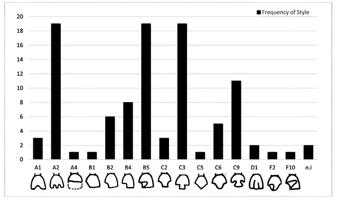 В первую очередь захотелось, конечно, найти более подробно описанные и изученные примеры похожего поведения. И очевидно, это майя. Отверстия, украшения и разного рода модификации зубов у этой цивилизации весьма известны и хорошо сохранились. Их манипуляции как носили эстетический характер, так и служили ритуальным целям. Майя умело сверлили зубы с помощью таких инструментов, как тонкие медные трубки и абразивные вещества, например порошковый кварц. Эти модификации часто проводились как обряд посвящения, обозначающий переход во взрослую жизнь, и включали инкрустацию зубов драгоценными камнями, такими как нефрит, бирюза и гематит. И что, интересно сейчас такой визуальный ряд, когда на передние зубы наклеены стразы/скайсы[37], тоже весьма популярен. Майя же, не зная ничего о структуре зуба, функциях эмали, пульпе и прочем, ни в чем себя не ограничивали: стачивали передние резцы и клыки в треугольные акульи конусы, пилили замысловатые квадратные формы, сверлили сквозные дыры. Сейчас, если вам показать сквозное дупло в передних резцах, когда при улыбке можно заглянуть в рот даже сквозь сжатые зубы, это не вызовет восторженных восклицаний «у древних майя была развита стоматология». Тут любому понятно, что если стоматология тогда и была, то что-то не то они с ней делали. Вот, например, график, отражающий, как часто майя выпиливали ту или иную форму[38].
