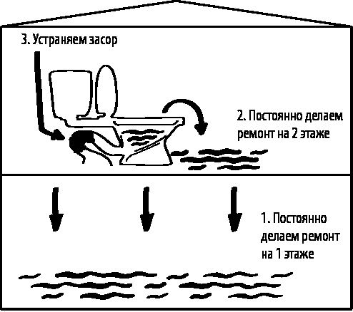 Приведу образный пример. Давайте представим, что в двухэтажном доме на втором этаже засорилась канализационная труба. Из-за этого вода затопила весь второй этаж и через какое-то время просочилась на первый, испортив ремонт. Что лучше и эффективнее сделать жильцам?