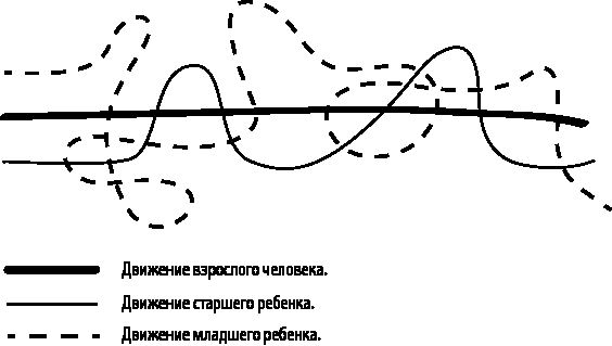 Именно это я увидел, когда шел зимой по заснеженной дорожке с двумя детьми десяти и пяти лет. Самая активная линия движения принадлежит ребенку пяти лет, он бегает больше всех. Старший двигается меньше, чем младший, но все равно значительно больше, чем взрослый (ваш покорный слуга). Именно поэтому дети могут есть достаточно много сладостей и при этом не толстеть. Дети и подростки часто не ждут лифт, а бегут по лестнице (даже вверх, а уж тем более вниз). Они обожают любые активности на детской площадке, тогда как их родители предпочитают сидеть рядом на скамеечке. Дети даже мультики смотрят зачастую двигаясь, раскачиваясь, вставая и садясь на корточки.