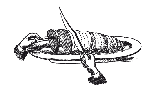 ● Нарезка жаркого. Готовое мясо следует поставить на стол, минут на 10, 15, и только по прошествии этого времени приступить к его нарезке. Слишком горячее мясо нельзя правильно нарезать: поверхность разреза станет неровной, как при нарезке горячего хлеба. Как сырое мясо, когда оно режется на куски, так и приготовленный каким бы то ни было способом цельный кусок мяса следует резать немного наискось и непременно поперек волокон (см. рис. 1). При этом условии мясо становится мягче, сочнее и потому легче разжевывается. Правильная нарезка, т. е. что она производилась действительно поперек волокон, узнается по тому, что с поверхности разреза сочится или выступает сок и, кроме того, волокна идут в виде закруглений, а не продольными полосами. При неправильной же нарезке, т. е. вдоль волокон, сок не выступает, и нарезанные куски кажутся сухими.