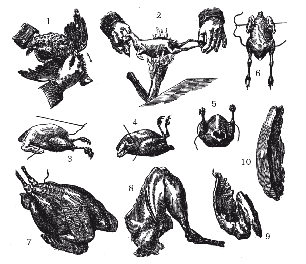 Снятие с костей. Если птица предназначается для рубленых или соусных блюд, где нужна только чистая мякоть, а кости употребляются на соус, то после ощипывания перьев не нужно опаливать и потрошить, а сначала нужно снять кожу, потом мясо. Кожу снимают, сделав ее продольный надрез на груди, потом отделяется все мясо с каркаса при помощи острого филейного ножа. При приготовлении фаршированной птицы без костей мясо отделяется от них несколько иначе: опалив и вымыв птицу, делается продольный разрез кожи на спине; затем, оставив только кости у крылышек и у нижней части ножек, весь каркас отделяется филейным ножом от мяса; таким образом, мясо остается при коже, а остов вынимается прочь. Как в одном, так и в другом случае внутренности вынимаются уже потом из остова.