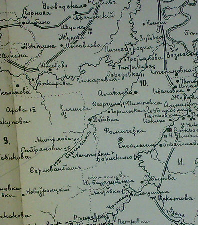 Далее показана Осоргинская волость на карте 1890-х гг. (№ 10). Оренбургский гужевой тракт прорезает её, город расположен севернее, в устье речушки Берсювань – село Вознесенское (Чесноковка). Пунктиром нарисованы границы волости, они в основном проходили по речкам Дёме и Уршаку, между ними и лежала Осоргинская волость, за небольшими исключениями.