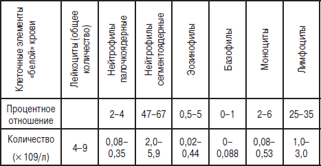В норме содержание лейкоцитов (всех видов – см. далее «Лейкоцитарная формула») в крови составляет 4–9 х 109/л.