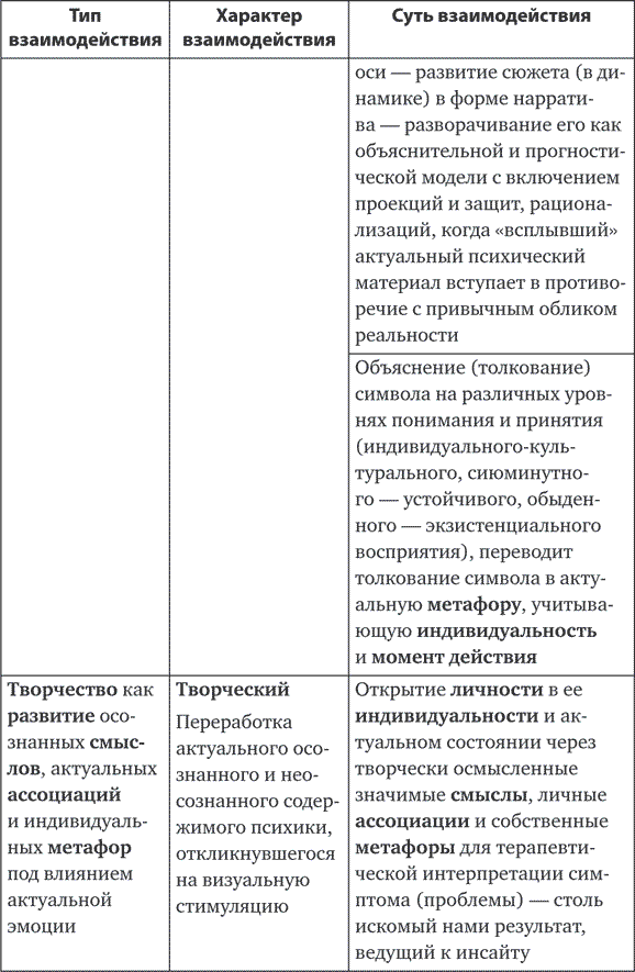 В таблице предпринята попытка свести воедино психологические феномены, задействованные в процессе работы с метафорическими ассоциативными картами. Надо понимать, что не все из упомянутых явлений присутствуют одновременно и всегда, но взаимосвязи между ними в таком представлении видны более ясно.