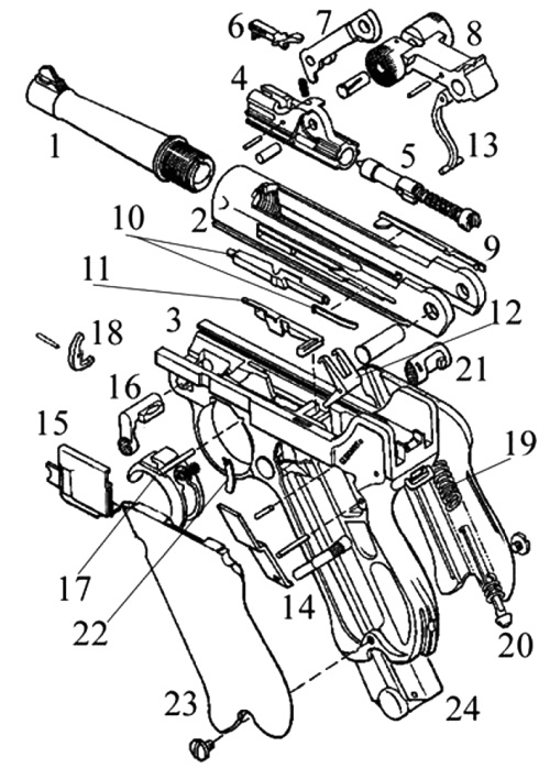 Рис. 6. Основные части пистолета П-08 (Парабеллум)