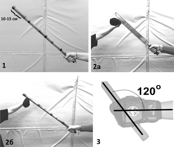 Важным моментом является сохранение правильного угла между палкой и предплечьем в момент удара. Маленький угол сокращает дистанцию, на которой может быть нанесен удар, а слишком большой не позволяет наносить мощные удары за счет «слабого звена» в запястье (рис. 2 – 3). Наиболее правильным является угол в 120о