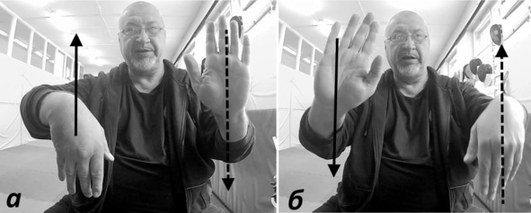 1) Выполнять движение кистями в противоположных направлениях в вертикальной плоскости – одна кисть вниз, ладонью к себе, другая вверх, ладонью от себя.