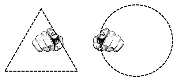 Руки располагаются перед грудью, пальцами вперед. Одновременно рисуем по воздуху – одной рукой круг, Другой рукой треугольник.