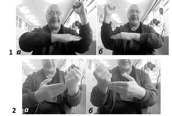 1) Левое предплечье расположено вертикально, кисть сжата в кулак. Правое – горизонтально, кисть раскрыта, пальцы на уровне локтя левой руки. Быстро менять положение рук.
