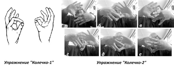 Поочерёдно и очень быстро перебираем пальцы рук, соединяя в кольцо с большим пальцем указательный, средний, безымянный, мизинец. Сначала можно каждой рукой отдельно, потом одновременно двумя руками. Затем одна рука начинает с «колечка» указательный-большой, а другая – мизинец-большой