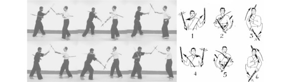 5. Атака по углу 1 – правая палка бьет в кисть навстречу, левая свобит по ходу движением сонкити и татасада.
