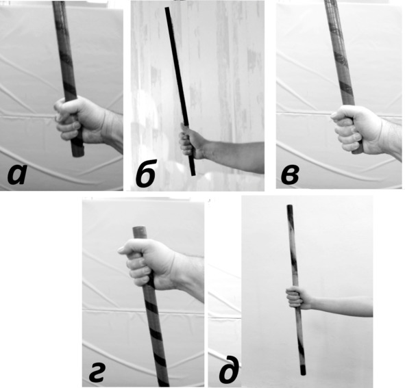 Варианты хвата палки – прямой с коротким пуньо (а); прямой с длинным пуньо (б); прямой без пуньо (в); обратный (г); дос пунтос (д)