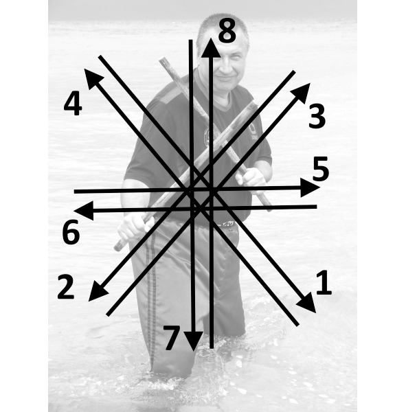 В Добле Бастон мы используем ту же траекторную базу, что и в Соло Бастон, но, на начальном этапе, упрощаем ее до системы четырех углов – диагональные удары сверху в голову и колени.