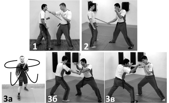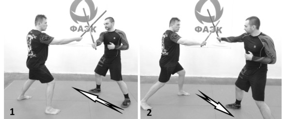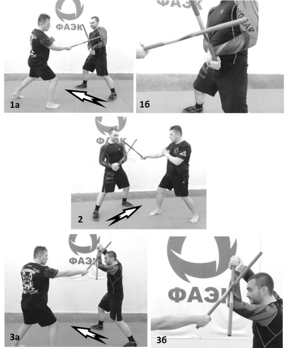 – дистанция контакта оружием – расстояние между противниками позволяет производить воздействия своей палкой на палку противника. Для выполнения ударов по противнику необходимо сделать два шага (рис. 5б). Это основная дистанция для подготовки своих действий.