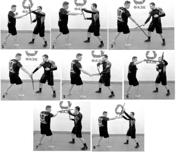 Один из партнеров выполняет входы с тычковыми ударами. Второй защищается палкой или шагом назад и отвечает ударом планчада на верхнем уровне. Ответ наносится с той стороны с которой выполнялась атака. Первый номер выполняет контрзащиту и возвращается к выполнению одиночного синавали одной палкой. Эта комбинация называется «тусок» (рис. 18).
