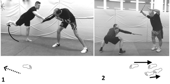 Рисунок 14. Ретирада лутанг (1) и ретирада пасабад (2) для защиты от атак по ногам