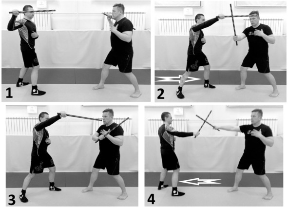 На начальном этапе выполняется упрощенный вариант этого упражнения, в котором оба партнера, находясь на дистанции ларго, выполняют удары одной палкой по схеме одиночного синавали, т.е. по углам 1, 4, 2, 3 добле бастон (рис. 17).