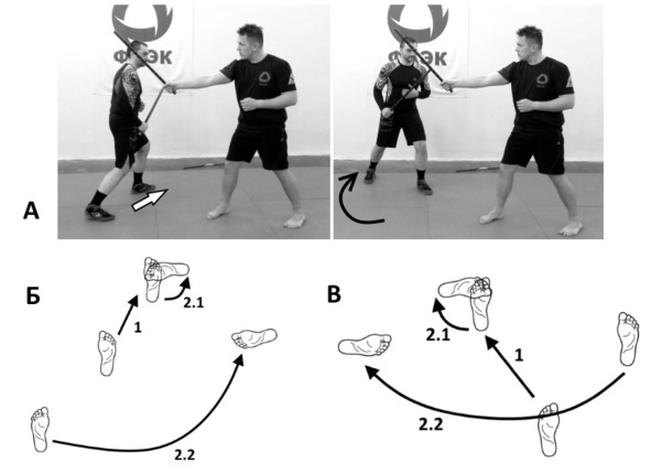 Отшагивания вправо или влево с поворотом в противоположную сторону для ухода с линии атаки. Шаг выполняется: вправо – правой ногой; влево – левой ногой (рис. 1).