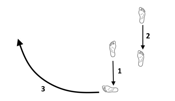 Часто движение выполняется после разрыва дистанции. В этом случае первый шаг по кругу начинается с сзади стоящей ноги, которая, в момент шага назад, ставится носком по направлению движения (рис. 3).