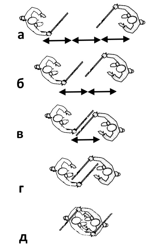 – ближняя дистанция (корто) – возможно нанесение ударов пуньо, а также ударов невооруженной рукой (рис. 5д). Эта дистанция позволяет переходить к применению разоружений, бросков и болевых приемов.