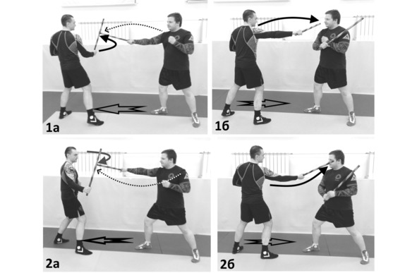Модерн блоки выполняются на шаге вперед, палка выдвигается навстречу удара противника, вторая рука поддерживает палку за середину (рис. 14). Основное их назначение – прервать атакующий удар противника в самом его начале и, за счет этого, получить возможность провести захват за палку или вооруженную руку противника.