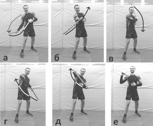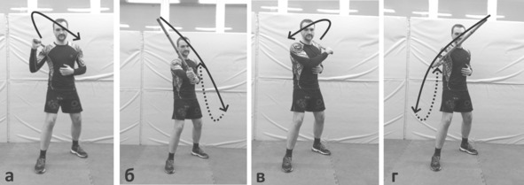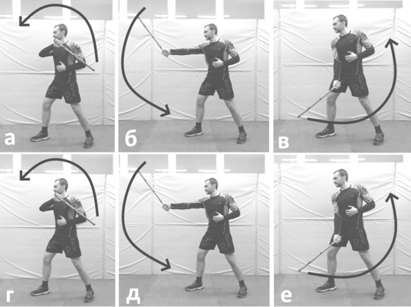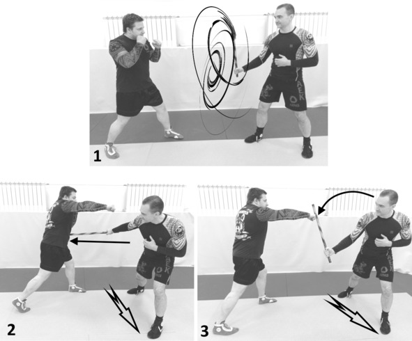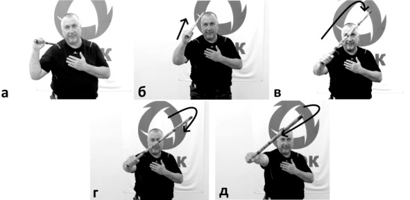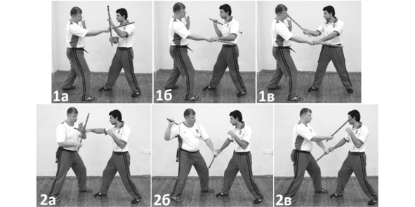 Эти действия можно рассматривать не только как отдельные способы противодействия нападающему, но и как три стадии защиты с палкой – угроза, остановка, работа «на поражение».