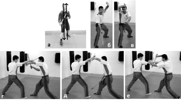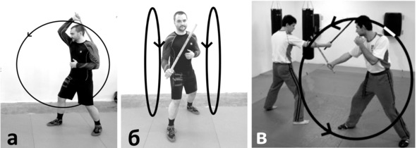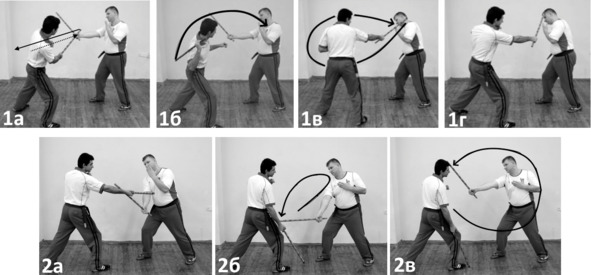 К техникам сомбрада и плума на этом уровне добавляются еще защиты верхнего уровня вертикальной палкой – справа и слева. Важная особенность этих зашит в том, что они выполняются движением оружия на себя с одновременным разрывом дистанции (рис. 12).