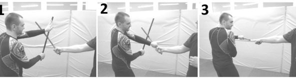 В этом варианте первый удар в комбинации является защитным действием (ударом в атакующую руку, встречным ударом по оружию противника, переведением удара по принципу палис), а второй и третий – ответом.