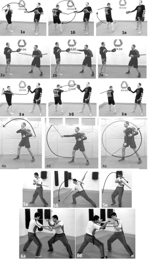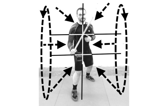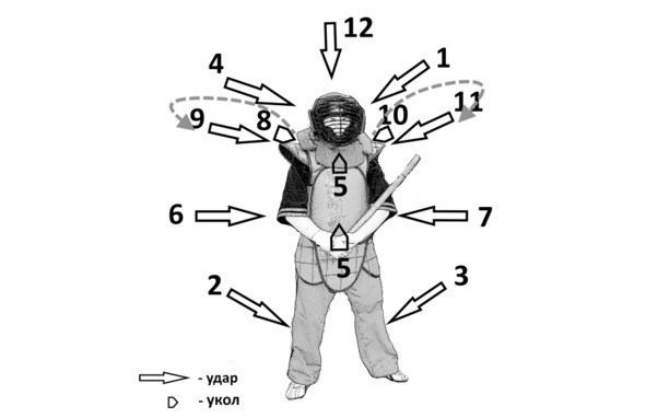 При использовании палки в левой руке, углы зеркально отображаются (т.е. начинаем с удара слева по диагонали в голову и т.д.).