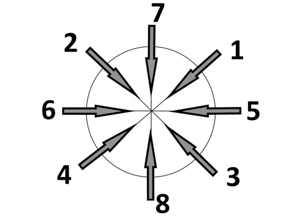 В данном случае используется последовательность движений по основным 8 направлениям, образуемым траекторими экис и круз (рис. 11).