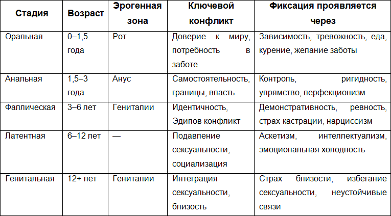 Если возникает травма, запрет или дефицит – часть его психики «застревает» в этом этапе. Так возникает фиксация: повторяющийся сценарий, поведение, зажим, страх или телесный симптом.