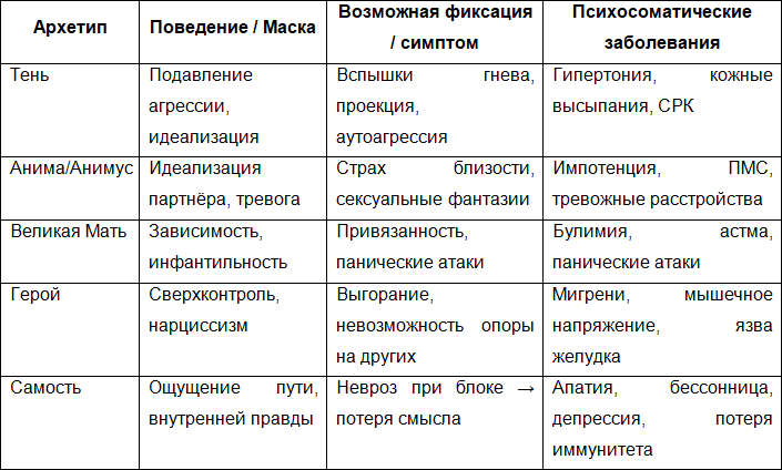 • Фиксация на архетипе может привести к соматике (например, подавленная Тень → иммунные заболевания) [3], [4].