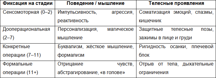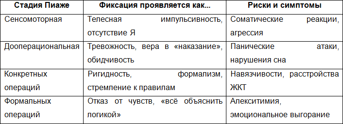 • Фиксация на стадии Пиаже – это когнитивная незрелость, которая может замедлять терапевтический процесс, поддерживать тревожность или усиливать телесные симптомы.