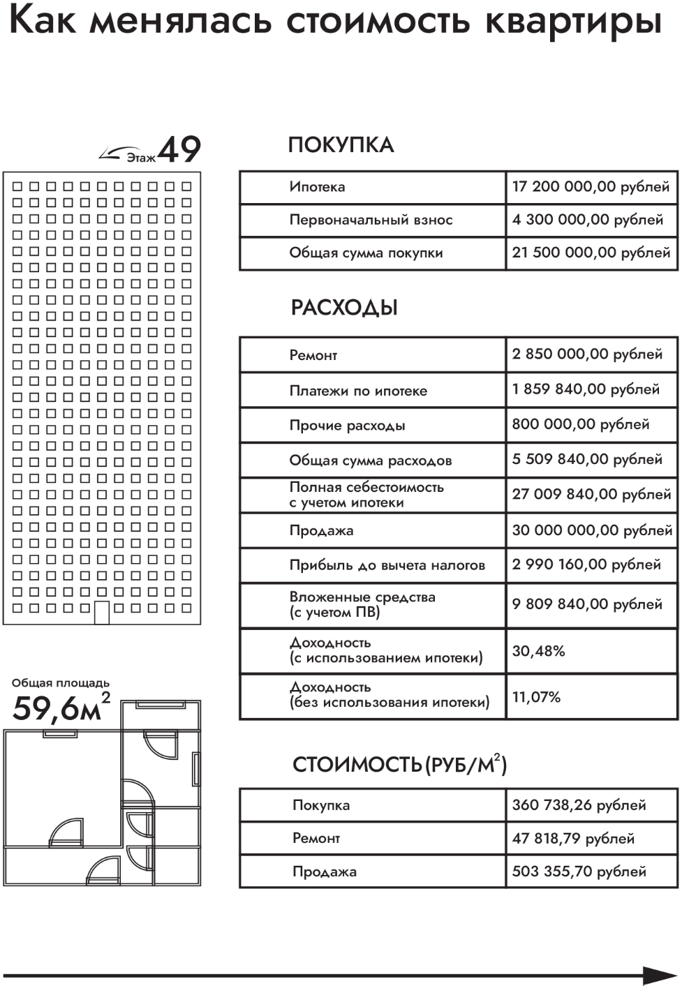 Другой вариант – прибегнуть к ипотеке. Предположим, объект стоит 21,5 миллиона рублей. Средний первоначальный взнос в зависимости от рисков, которые может представлять для банка конкретный заемщик, варьируется от 20 до 30 % стоимости объекта. Если исходить из суммы первоначального взноса в 20 %, то для покупки объекта за 21,5 миллиона рублей за счет ипотечных средств понадобится 4,3 миллиона рублей. Тогда ипотечные средства будут составлять 17,2 миллиона рублей. Перед покупкой недвижимости необходимо четко спланировать все расходы: на страховку по ипотеке, ремонтные работы в квартире, мебель и бытовую технику, а также на услуги юриста и риелтора. Ну и, конечно же, на протяжении всего срока владения данной недвижимостью мы должны запланировать расходы на ежемесячные ипотечные платежи. Предположим, все эти расходы составят 5,5 миллиона рублей. Таким образом, для покупки данной квартиры понадобится 9,8 миллиона рублей. Себестоимость рассматриваемой квартиры составляет 27,1 миллиона рублей (стоимость квартиры плюс расходы). Далее стоит прикинуть, какова рыночная стоимость такой же квартиры, но уже с ремонтом. Посмотрев на просторах интернета все рекламные объявления, можно предположить рыночную стоимость. Например, в нашем случае ориентировочная цена продажи составит 30 миллионов рублей. Итоговая прибыль по данной инвестиции составит 2,9 миллиона рублей до вычета налогов.