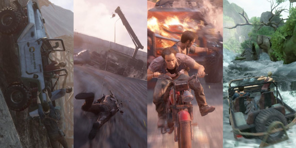 Uncharted 4: A Thief’s End (2016, Naughty Dog) может похвастаться большим количеством щекотливых ситуаций, в которых игрок находится на волоске от гибели. Так, например, исследуя горный участок Мадагаскара, внедорожник Нейтана Дрейка сваливается в пропасть и зависает на тросе лебедки. В головокружительной сцене преследования, главного героя тащат за грузовиком по земле на веревке. А в эпизоде с Либерталией, Нейтан и Елена падают на внедорожнике с моста в реку, которая заканчивается гигантским водопадом.