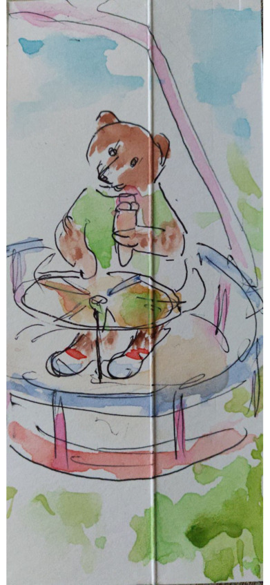 Когда очередь подошла, Мишка сел в уютную кабинку колеса обозрения. Оно медленно начало подниматься, открывая захватывающий вид на парк и его окрестности. Мишка сначала восхищённо любовался видами, но вскоре высота стала пугать его всё больше и больше. И вдруг, не выдержав, он закричал: «Спасите, помогите, опустите меня!» И, словно по волшебству, колесо медленно начало опускаться. Когда оно остановилось, Мишка облегчённо вздохнул: «Я чуть от страха не умер!»