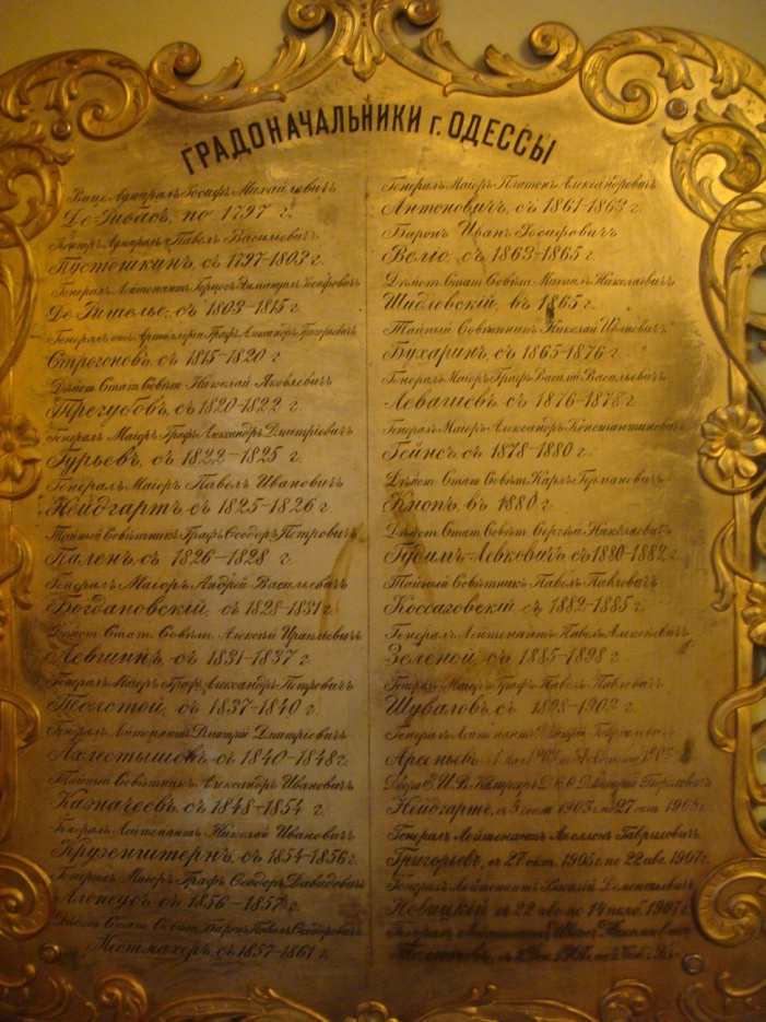 ГРАДОНАЧАЛЬНИКИ ГОРОДА ОДЕССА – Бронзовая табличка с именами и датами правления всех Одесских градоначальников вплоть до начала Первой Мировой войны. Выставлена в экспозиции Одесского историко-краеведческого музея.