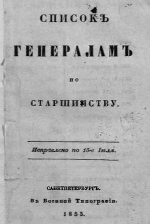 СТРАНИЦА ИЗ «СПИСКА ГЕНЕРАЛАМ ПО СТАРШИНСТВУ» ОТ 1855 ГОДА (с указанием чинов и наград)