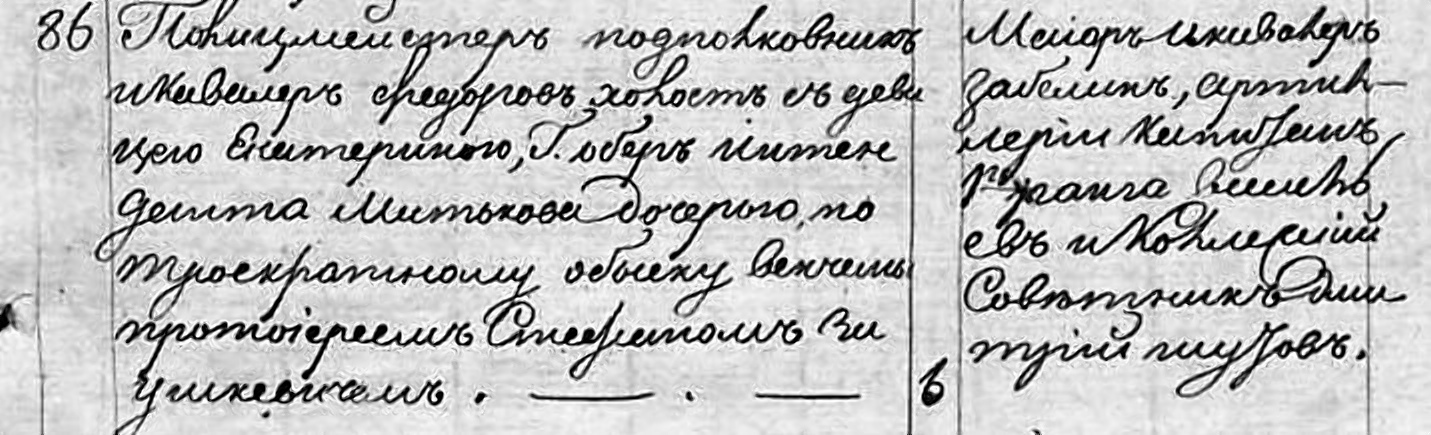 ЗАПИСЬ №86 ОТ 6 НОЯБРЯ 1821 ГОДА О ВЕНЧАНИИ ПОЛИЦМЕЙСТЕРА ПОДПОЛКОВНИКА П. И.ФЕДОРОВА С ДЕВИЦЕЮ ЕКАТЕРИНОЙ, ДОЧЕРЬЮ Г. ОБЕР ИНТЕНДАНТА МИТЬКОВА ДОЧЕРЬЮ