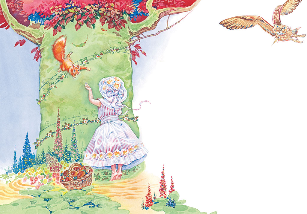А Соня и не заметила, как заснула, а утром проснулась рано, и сразу вспомнила о белочке, Стала искать ее, но в комнате никого не было. Она выбежала в сад и стала звать:
