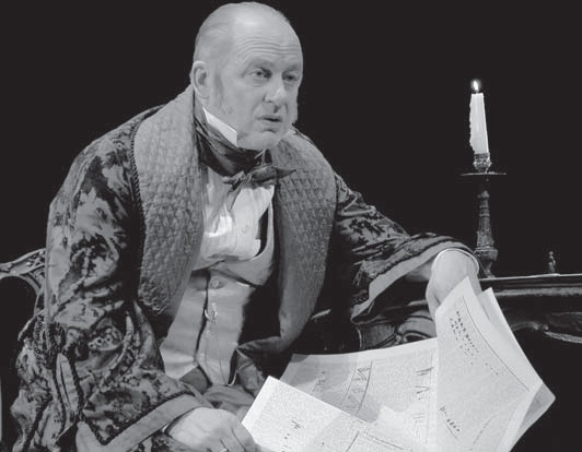 «Пусть каждый возьмет в руки по улице…» – нужно сказать серьезно, раздумчиво. Все задумались – как можно взять в руки по улице? Только в этих оговорках Городничего выражается страх, внешне очень спокойно, даже преувеличенно спокойно. И вместо шляпы надевает футляр не как трюк, а как некое смещение ума. Долго стоит в этом футляре, думая, что это шляпа, никто не смеет этого заметить. Поняв, наконец, свою ошибку, всерьез пугается своего состояния. Тема «сдвинутых мозгов» попадает в общее решение – фантасмагория. Это сложная сцена для Городничего. Все смешалось: коробка вместо шляпы, Держиморда, гарниза, церковь… Надо овладеть сценой ритмически. Внутренняя лихорадочность – помутнение разума.