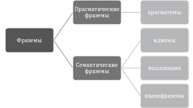 Общая классификация фразем по И. А. Мельчуку может быть представлена следующей схемой [Иорданская, Мельчук 2007: 223].