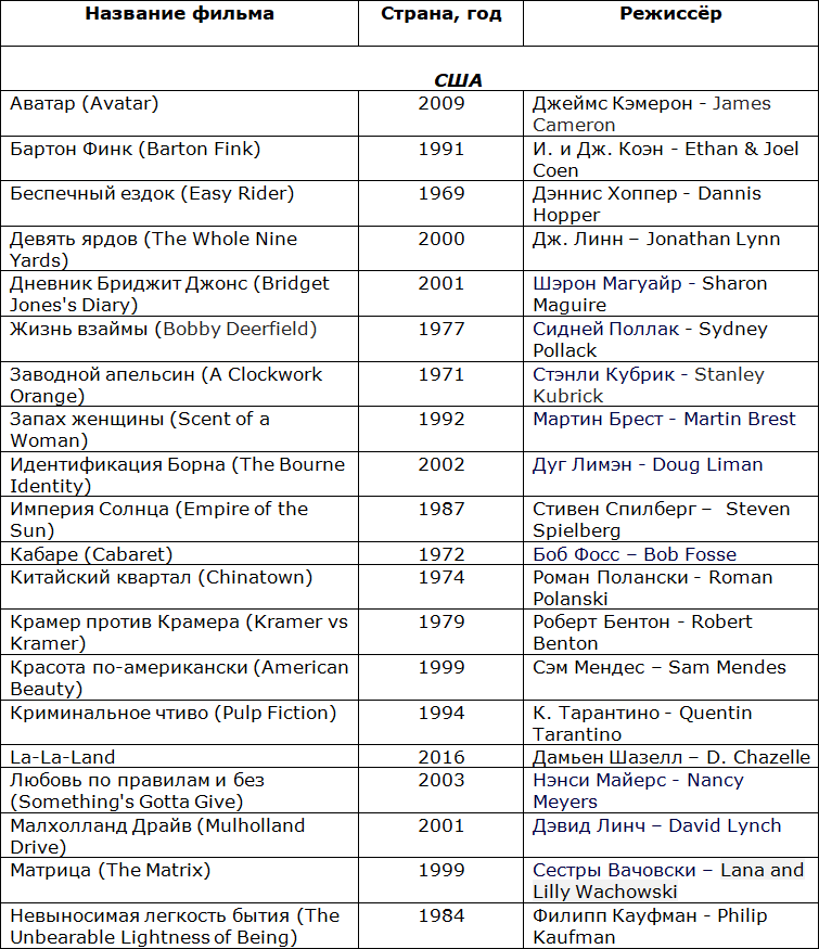 Но Америка – это не обязательно «традиционный Голливуд», есть много прекрасных, искренних и глубоких американских фильмов без лихих ковбоев, тупых мордобоев и кровожадных космических пришельцев (см. «Приложение»). Вот этот истинный режиссерский дар: заставить зрителя проникнуться фильмом, в котором, строго говоря, почти нет значительных событий, а есть только оголенные нервы героев – он и восхищает меня!