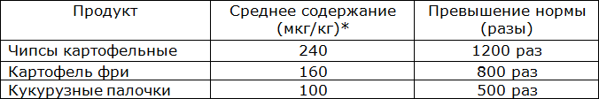 Угрозу здоровью представляют еще и те загрязнители, которые образуются в пище в процессе ее приготовления. Так, ученые из отдела контроля за пищевыми продуктами Стокгольмского университета провели еще в 2002 г. обследование заведений, в которых готовят и продают продукцию быстрого приготовления (фастфуд). Они обнаружили, что при тепловой обработке (жарить, кипятить в масле) пищи, богатой углеводами (например, картофеля), образуется много опасного канцерогенного вещества – акриламида. Пакетик чипсов, которые так любят дети и взрослые, содержит акриламида в сотни раз больше нормы (см. таблицу):