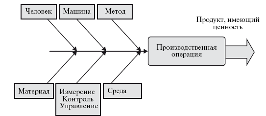 С точки зрения производителя, структура производственных затрат соответствует структуре ресурсов, потребляемых при выполнении операций производственного процесса (рис. 1.9). Эта структура включает затраты на персонал с учетом оплаты трудозатрат и затрат на квалификацию и мотивацию персонала, затраты на оборудование, затраты на осуществление технологического процесса (затраты на метод), затраты на материалы, потребляемые в ходе операции; затраты на управление, контроль, измерение и затраты на поддержание производственной среды в установленных пределах.