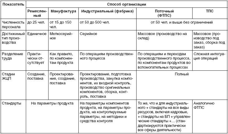 Компании – вне зависимости от рода их деятельности (производства продукции, добычи полезных ископаемых, производства услуг, выполнения научных исследований) – могут иметь следующие виды организации производства: ремесленное, мануфактурное, индустриальное (фабричное), поточное, или производственную систему Форда – Тейлора (ФТПС), и производственную систему «Тойота» (ТПС). Для удобства основные характеристики видов организации производства сведены в таблицу (табл. 1.2).